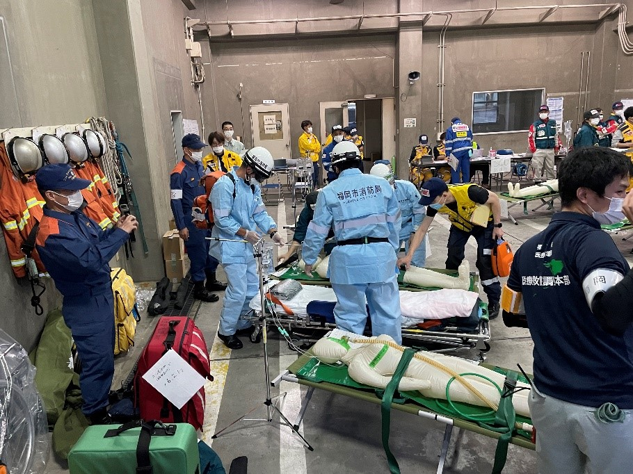 今回の訓練内容は北九州空港での傷病者を含む航空機事故を想定して行われ、各機関と連携を図りながら、指揮命令系統及び情報の集約、トリアージ能力の向上、各隊との連携を図ることができました。